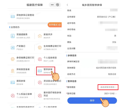 2.在业务经办栏目点击【暂停参保】进入。仔细核对个人信息,选择暂停原因,点击【保存】完成申请。