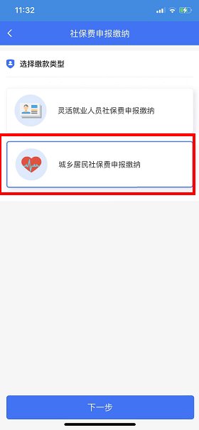 1.点击首页业务办理类中的“社保费申报缴纳”;选择城乡居民社保费申报缴纳,点击下一步。