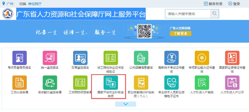 通过入口网址:https://ggfw.gdhrss.gov.cn/gdggfw/index.shtml,可分别选择进入社会保险公共服务系统/国家平台失业补助金申领