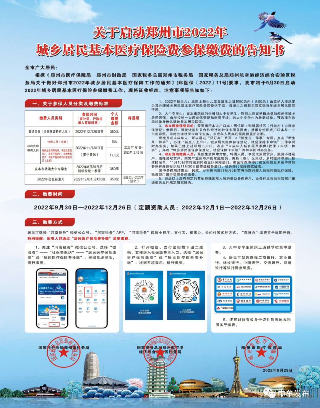 根据《郑州市医疗保障局 郑州市财政局 国家税务总局郑州市税务局 国家税务总局郑州航空港经济综合实验区税务局关于做好郑州2022年城乡居民基本医疗保障工作的通知》(郑医保〔2022〕11号)要求,我县2023年度的居民医疗保险费于9月30日开始征收,现将有关事项通告如下: