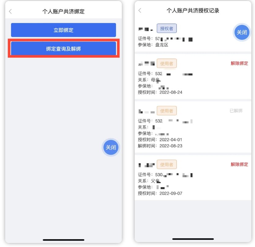 在“医保个人账户共济绑定”功能界面,点击下方“绑定查询及解绑”即可查看授权记录和被授权记录,在对应的绑定人右边点击“解除绑定”可进行解绑。