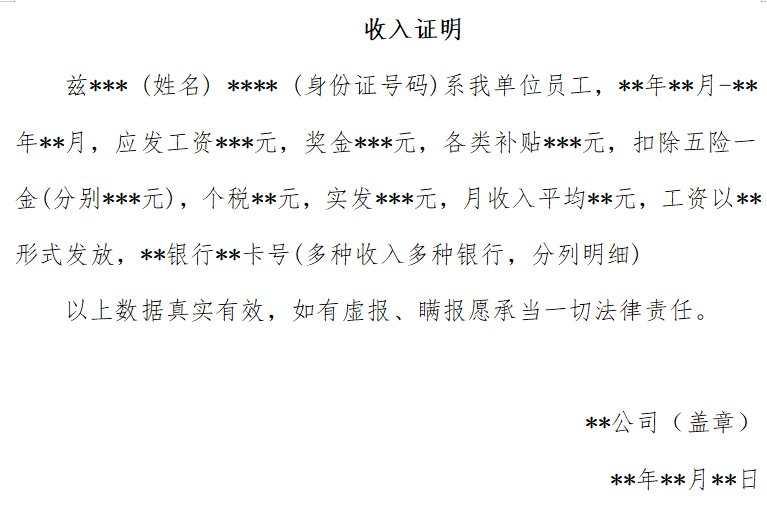 兹*** (姓名) **** (身份证号码)系我单位员工,**年**月-**年**月,应发工资***元,奖金***元,各类补贴***元,扣除五险一金(分别***元),个税**元,实发***元,月收入平均**元,工资以**形式发放,**银行**卡号(多种收入多种银行,分列明细)