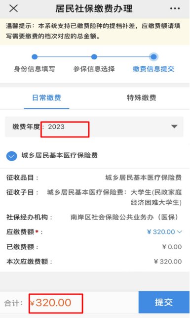 第三步:注意核对社保经办机构为南岸区社会保险公共业务办,选择2023年度,选择金额,缴费。