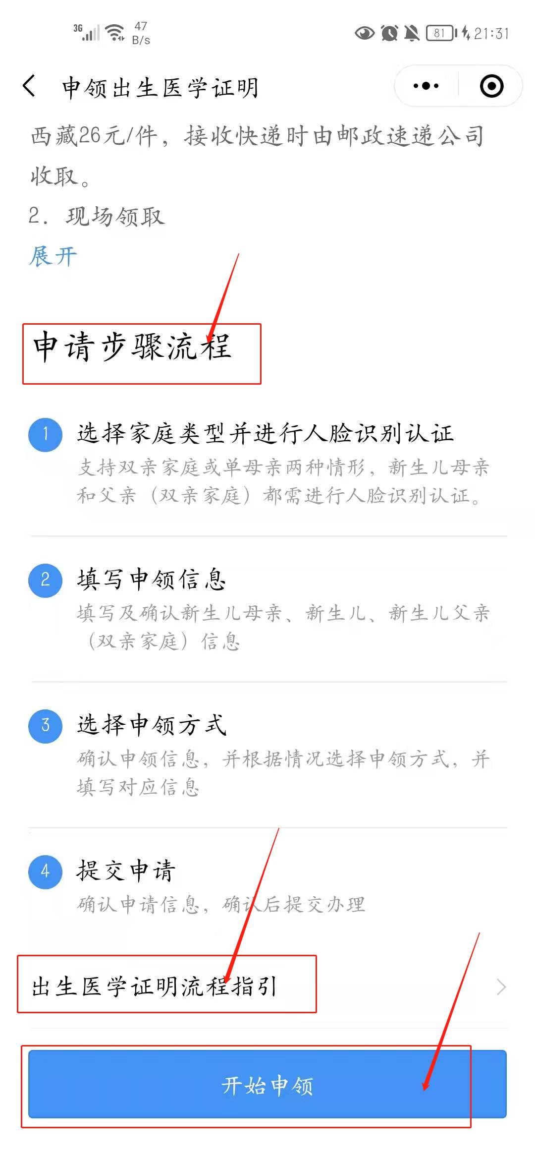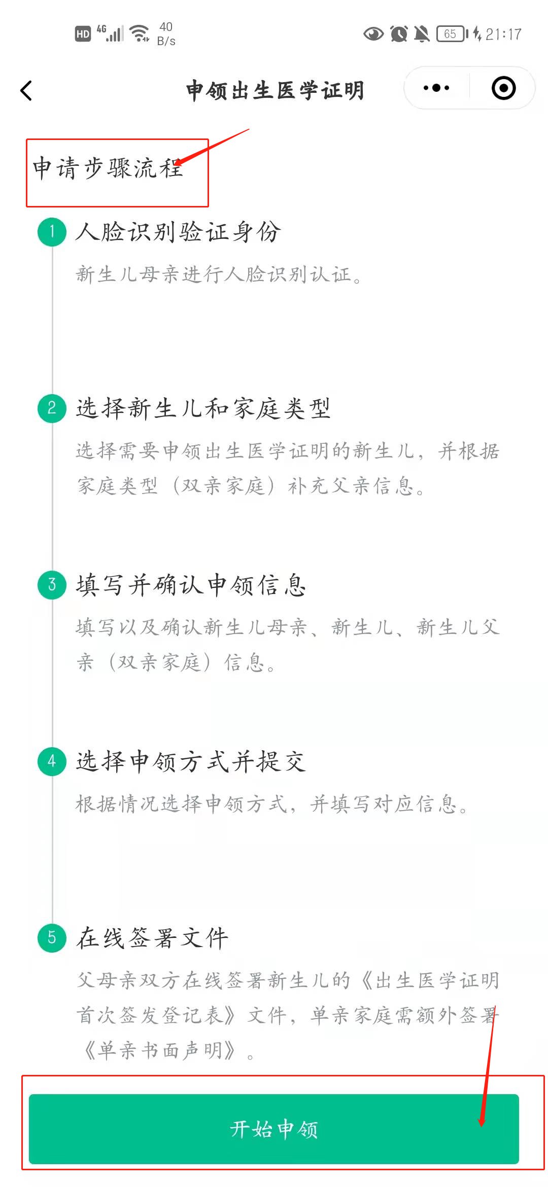 查看申领须知和步骤流程之后,可按照出生医学证明流程指引操作