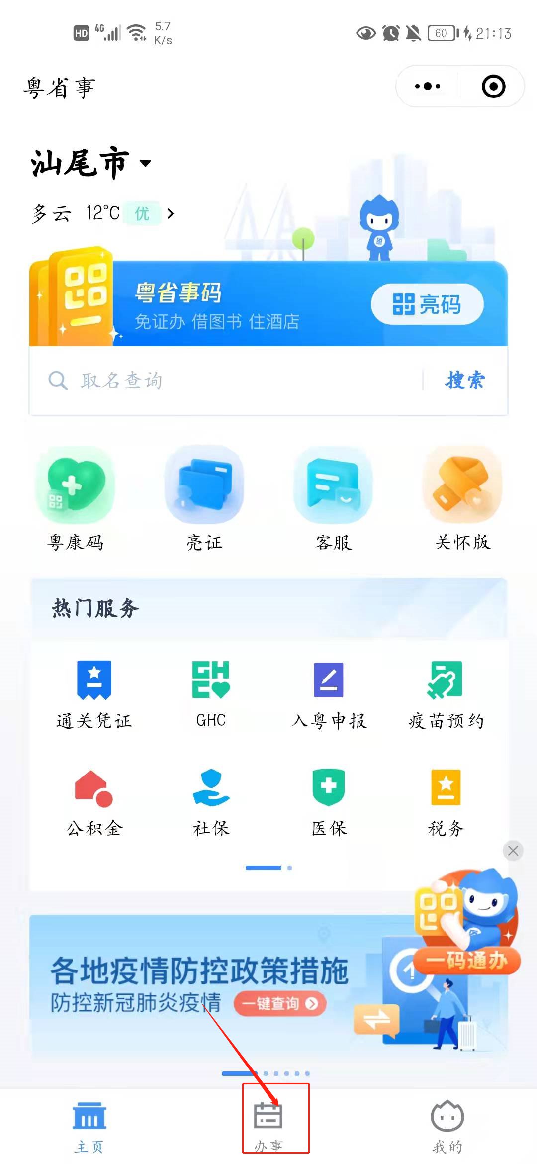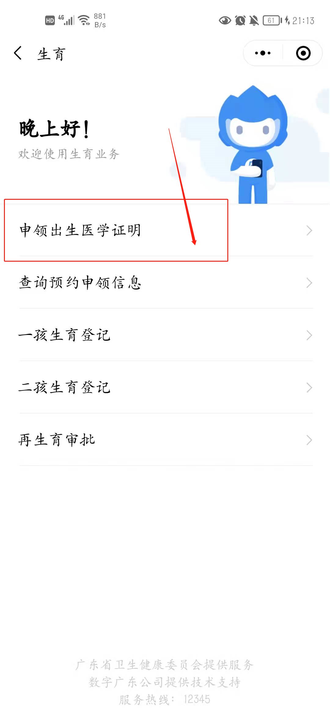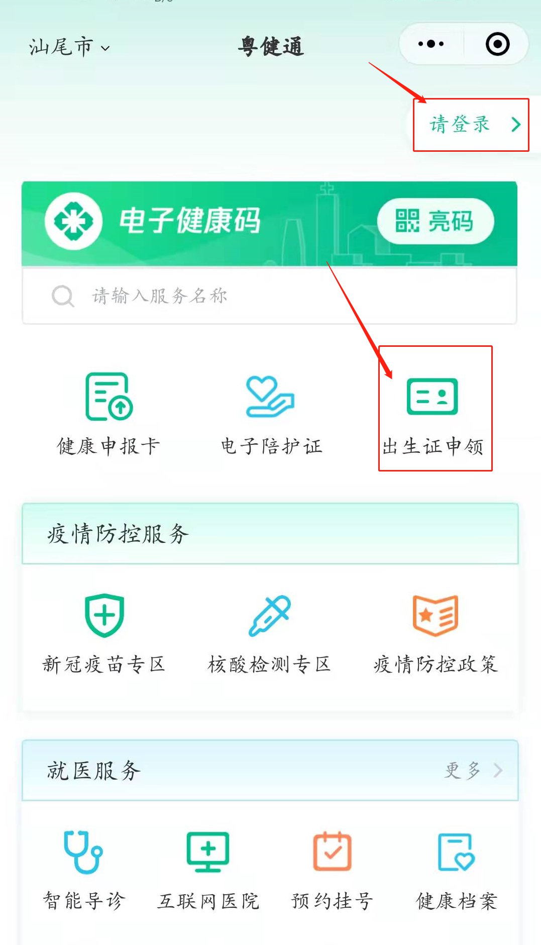 登录“粤健通”小程序首页,点击首页“出生证明申领”