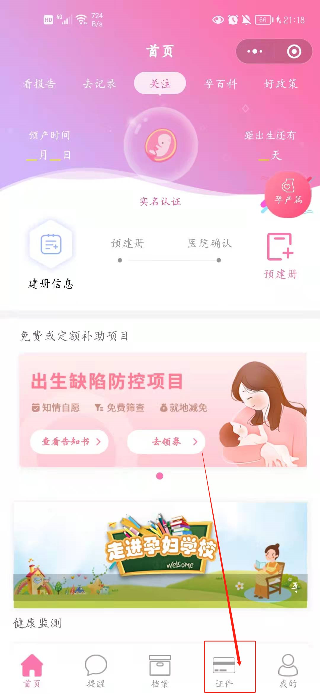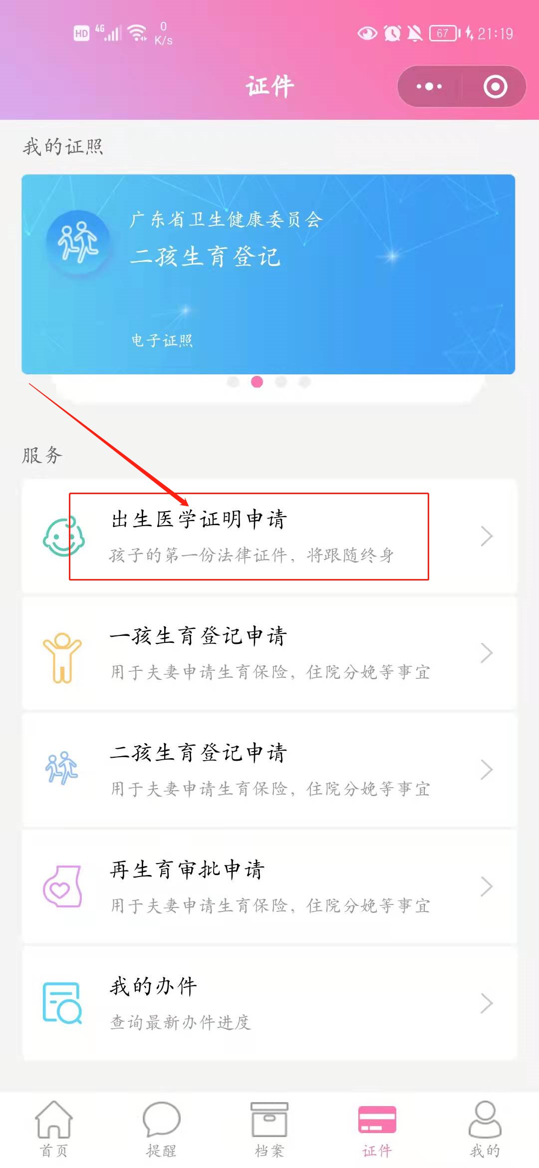 登录“广东母子健康e手册”小程序,进入首页,选择“证件”