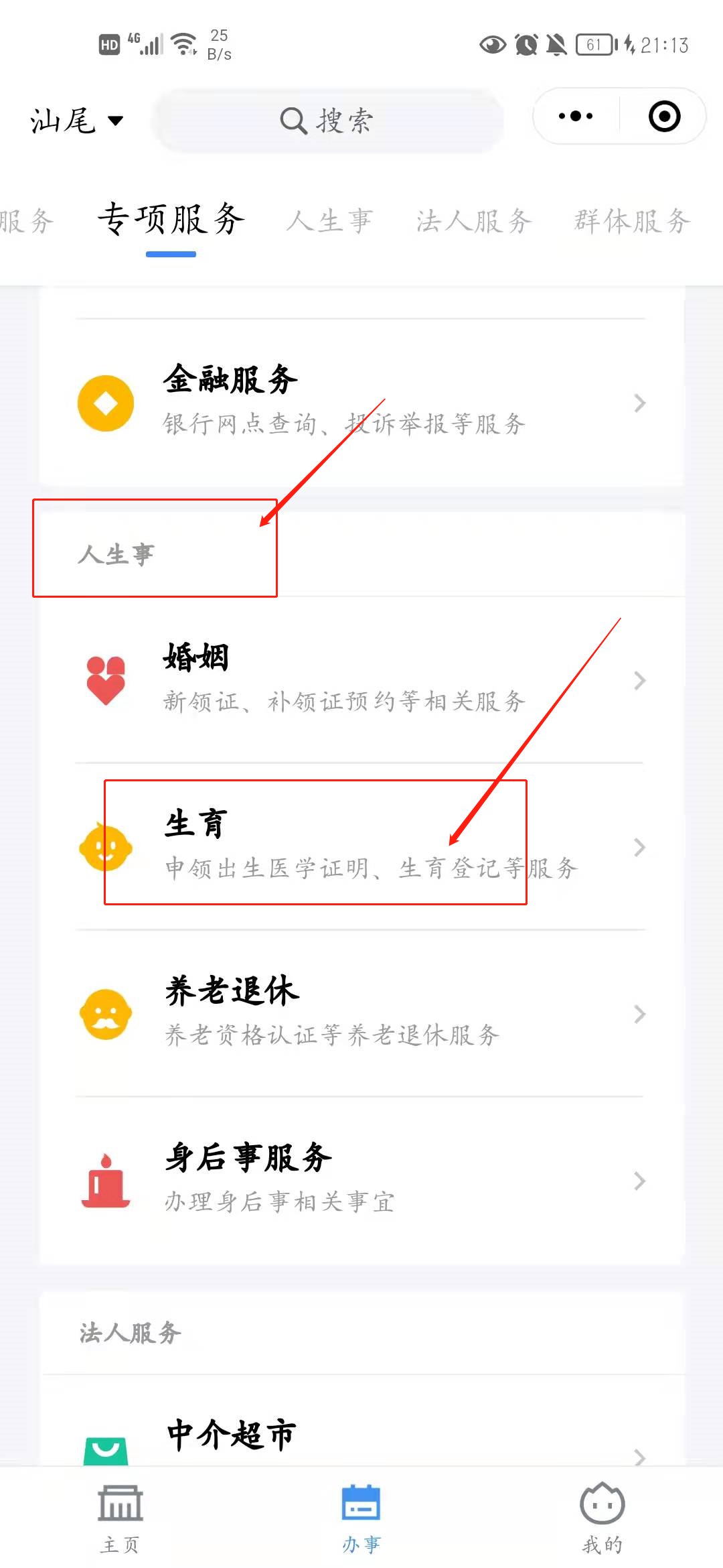 进入页面后,选择“人生事”的“生育”,点击进入。