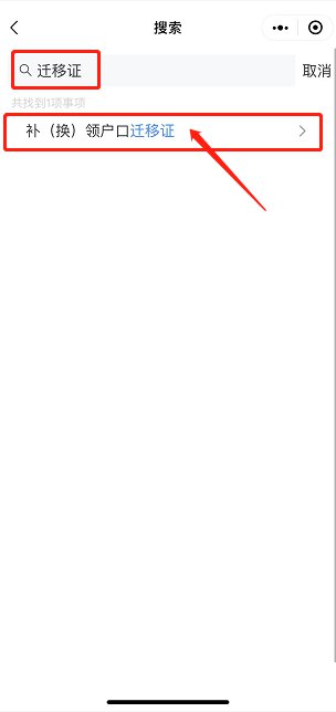 第二步:搜索迁移证-点击补(换)领户口迁移证-选择地区-预约办理