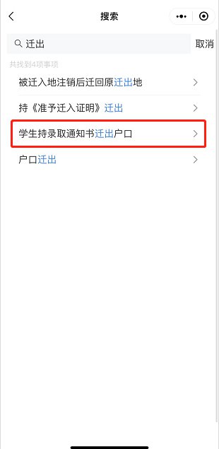 第二步:搜索迁出-点击学生持录取通知书迁出户口-选择地区-预约办理