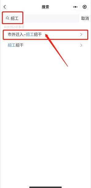 第二步:搜索投招工-点击市外迁入-招工招干-选择地区-预约办理
