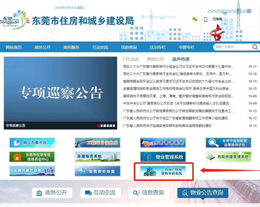 申购人可在2022年10月19日至10月21日登录网址:东莞市住房和城乡建设局 http://zjj.dg.gov.cn/,点击共有产权房资格审核系统图标进入,如下图: