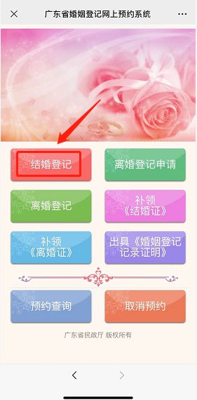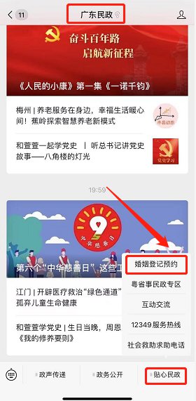 1、扫描上方二维码关注“广东民政”微信公众号—点击菜单栏“贴心民政”—选择婚姻登记预约