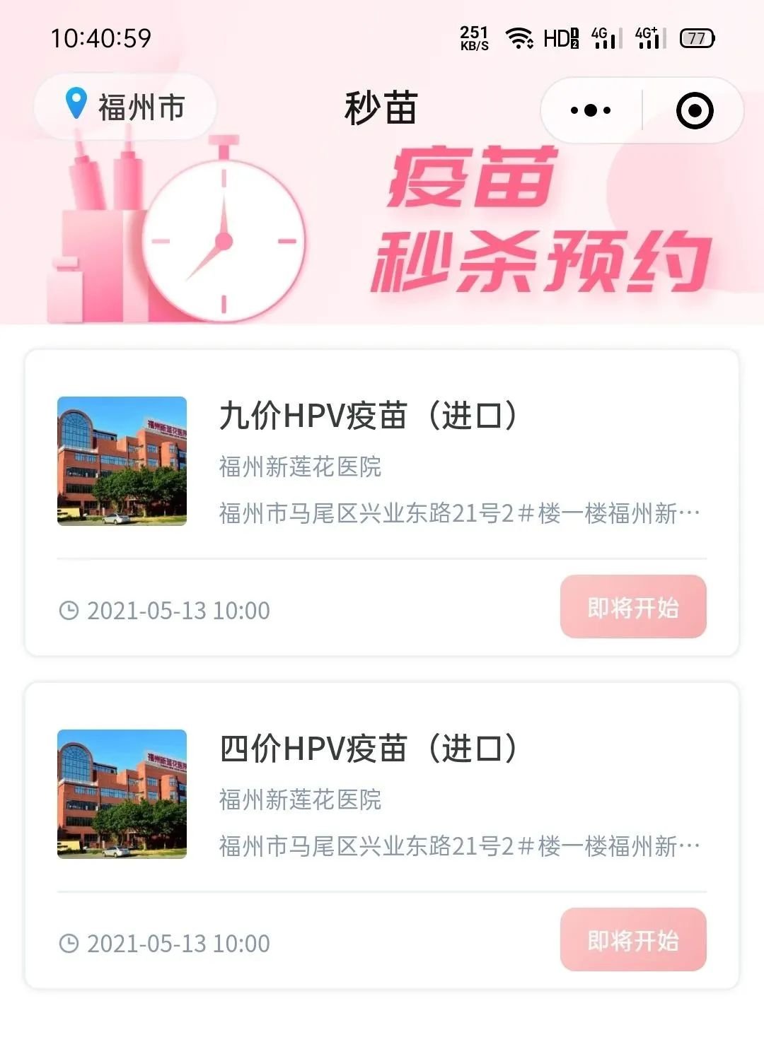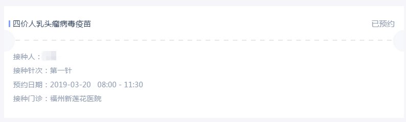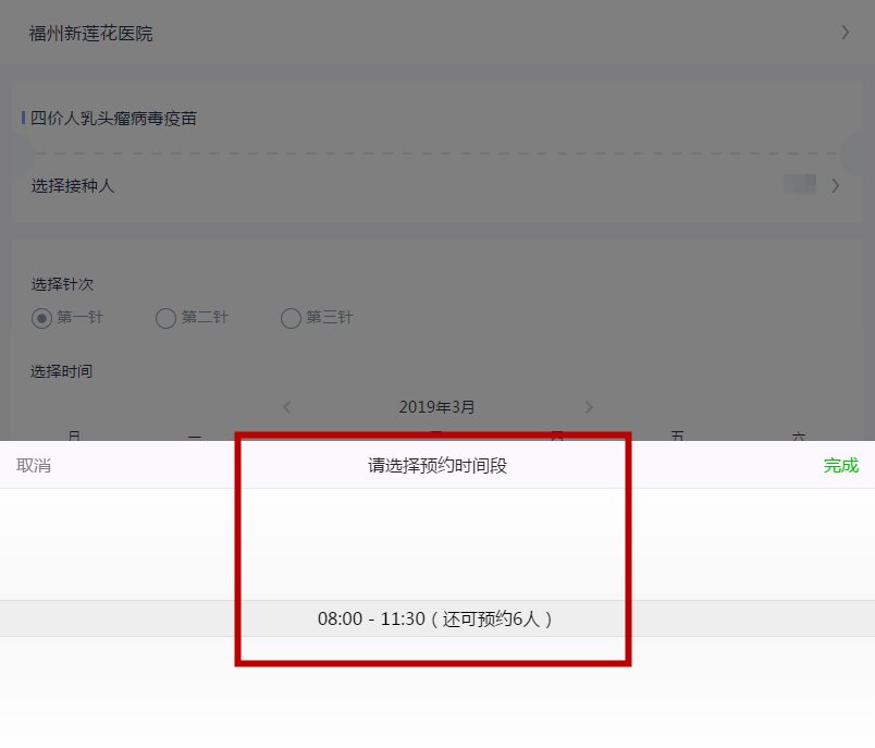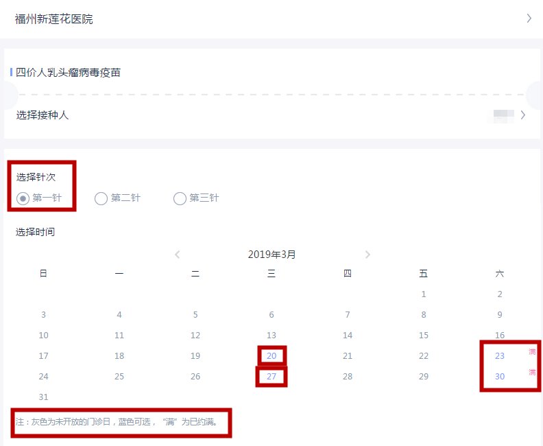 因为疫苗数量不多,福州新莲花医院目前预约HPV疫苗是预约一针接种一针,每一针都要进行预约,请选择好您预约的针次。