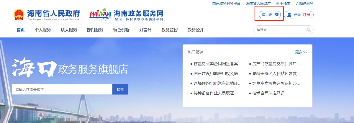 1、打开“海南政务服务网”,使用实名账号登录网站(无账号的需实名申请),地点切换至海口,搜索经办业务“技能提升补贴”。