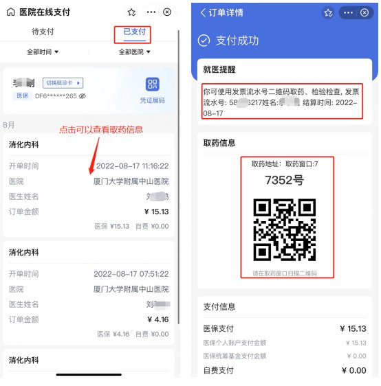 6、如页面关闭,可重新扫结算码或点我院支付宝小程序中的“门诊结算”,打开“已支付”界面,在订单详情页查看取药信息和发票流水号。