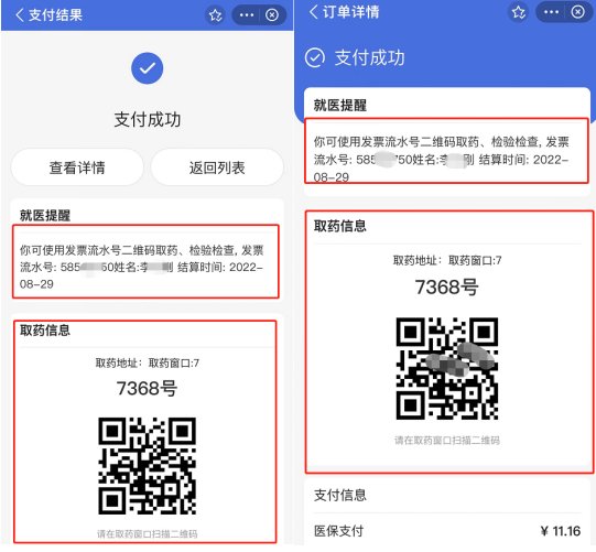 5、点击“完成”后,跳转支付成功页,可查看就医提醒。点“查看详情”,可查看详细的取药信息和就医提醒,可作为下一步取药和检验检查的依据。