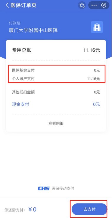 3、支付页面可生成医保费用和自费费用,可查看费用明细,点击“去支付”跳转确认付款页面。
