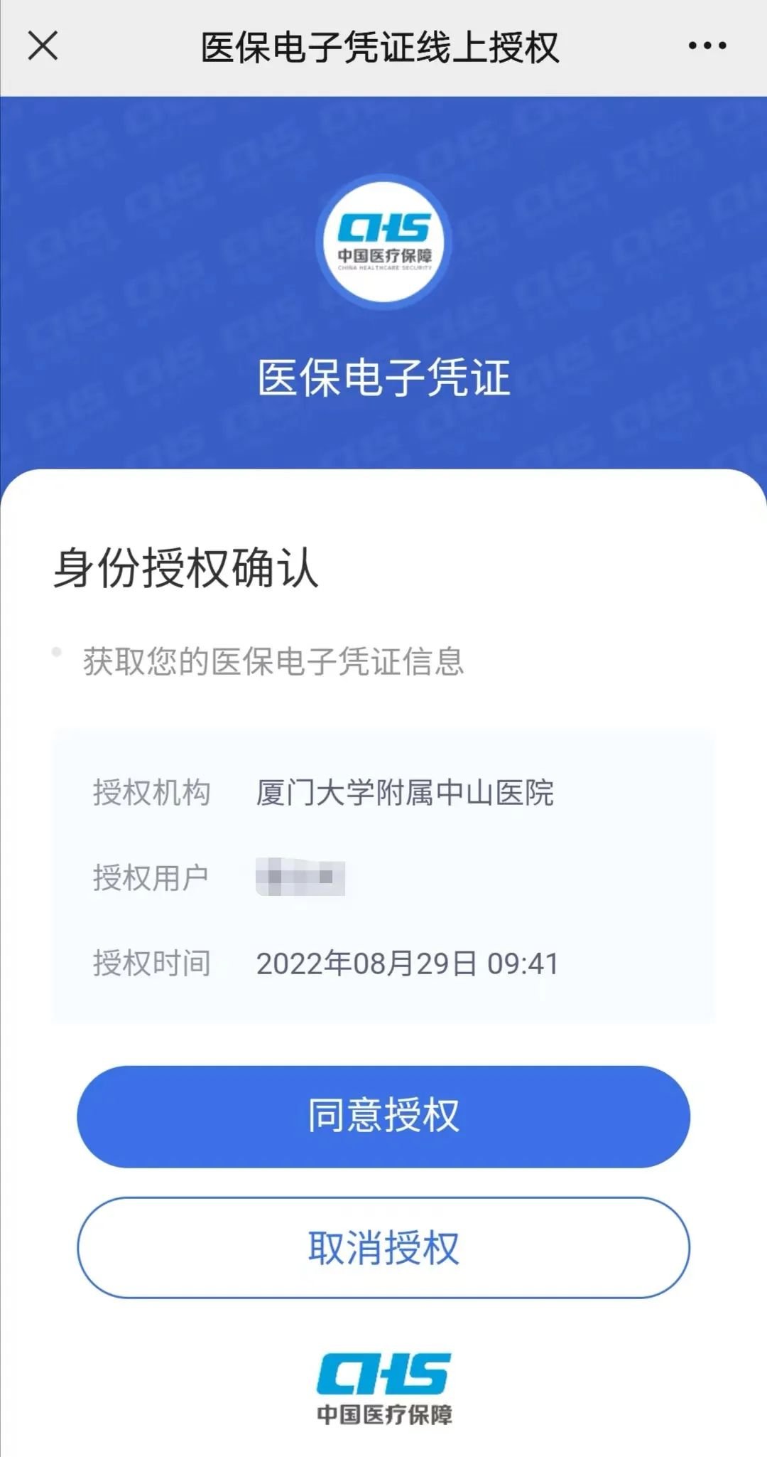1、进入电子医保凭证线上授权页面,完成厦门大学附属中山医院的线上身份授权。