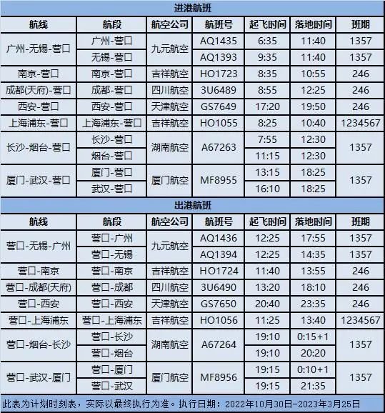 营口机场2022年冬航季航班计划表(营口机场2020冬春航班)