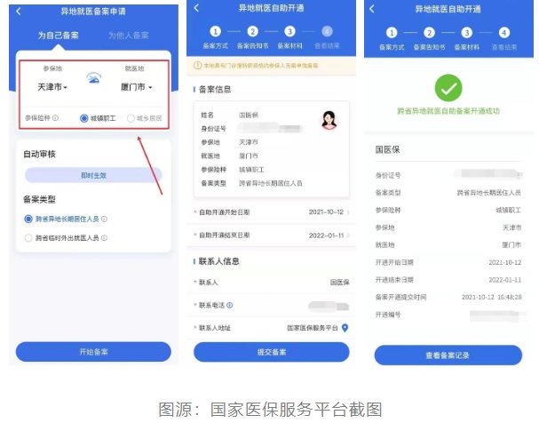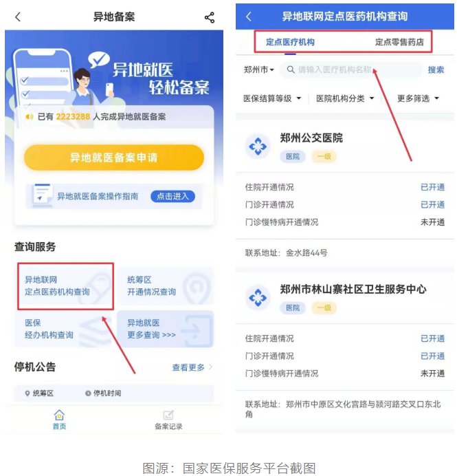 异地就医备案办理成功后,参保人员可前往备案就医地所有已开通跨省异地就医联网直接结算功能的医保定点医院就医 。在“国家医保服务平台”APP 首页“异地备案”申请页面 ,即可查询统筹地区及定点医疗机构和定点药店的开通情况(如下图)。
