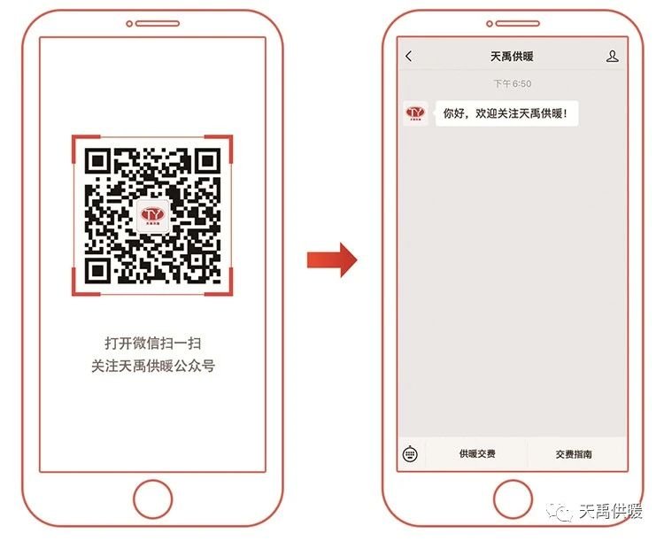 1、微信扫描天禹供暖二维码,并关注公众号,在底部菜单找到供暖交费;