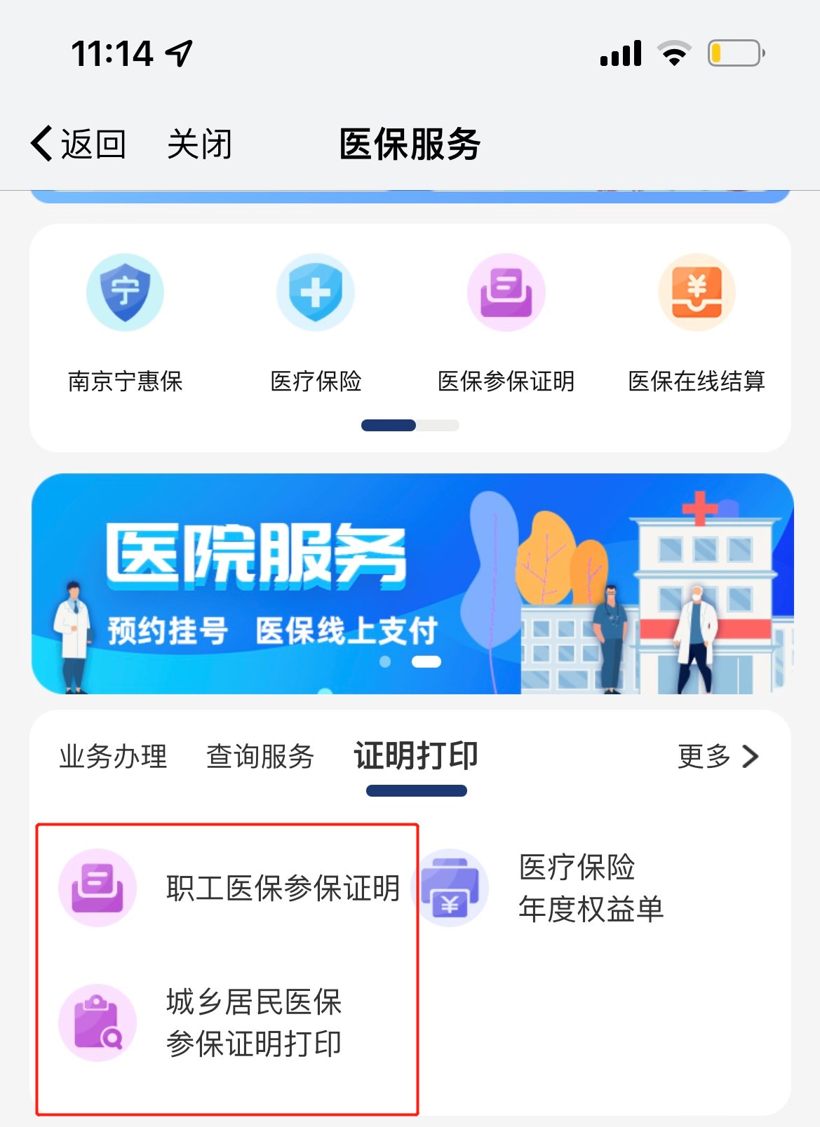 职工医保:我的南京“APP”——健康——医保服务——证明打印——职工医保参保证明/城乡居民医保参保证明打印