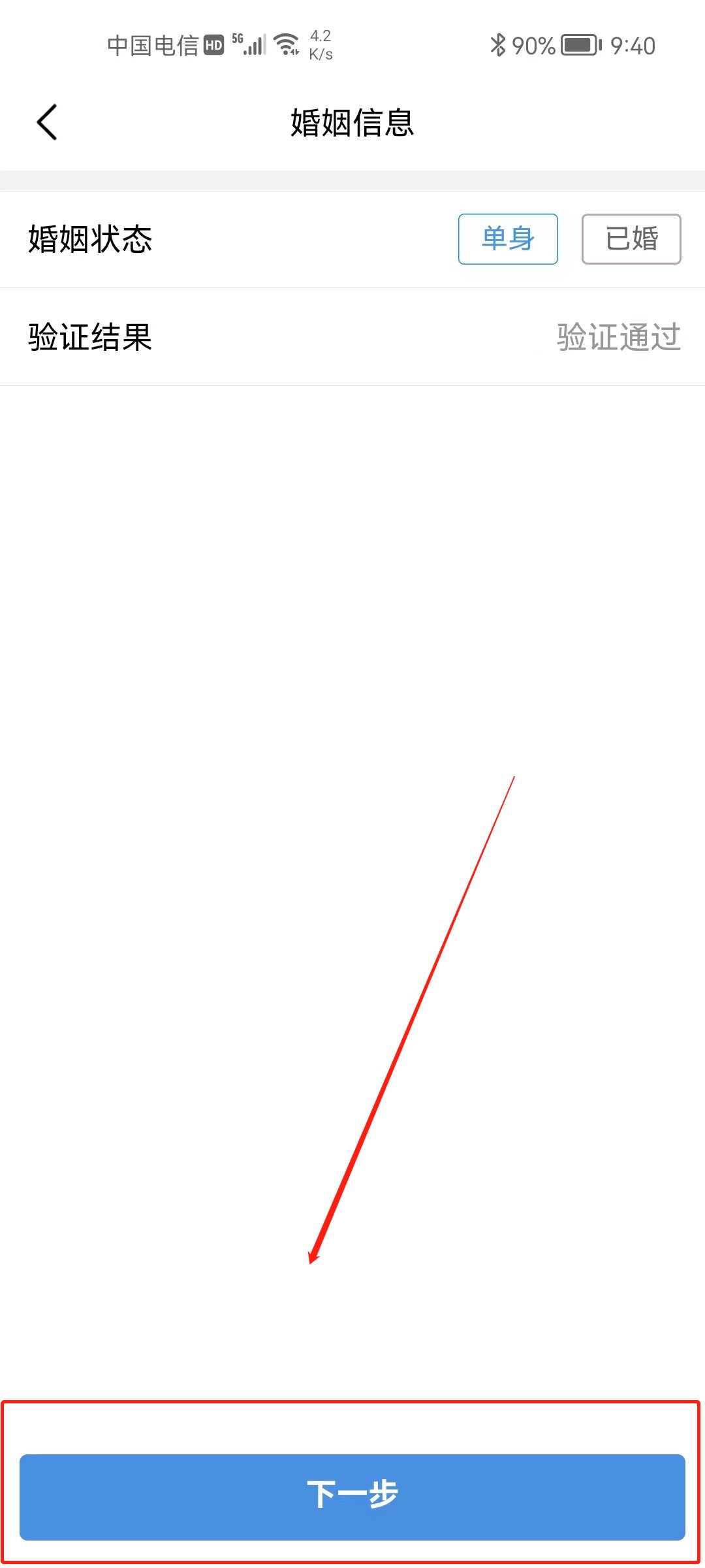 选择本人当前真实的“婚姻状态”,系统会进行验证的哦~确认信息无误后,点击【下一步】