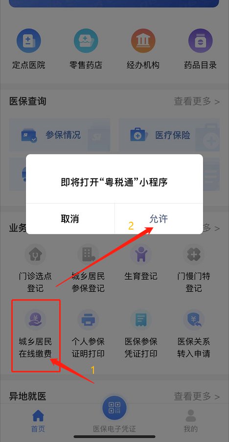 第二步:点击业务办理下的“城乡居民在线缴费”—点击“允许”