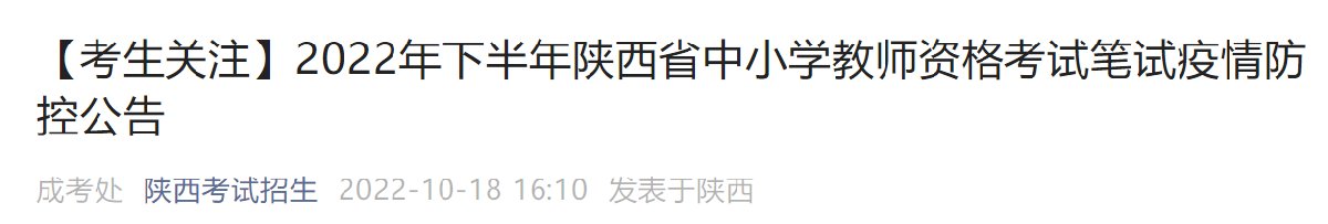 2022年下半年中小学教师资格考试(笔试)将于10月29日举行。为保障广大考生的生命安全和身体健康,做好疫情防控常态化下的考试组织实施,按照陕西省应对新冠肺炎疫情工作领导小组办公室《关于印发<陕西省教育等相关行业考试疫情防控工作指导方案(试行)>的通知》(陕肺炎办发〔2022〕39号)等相关精神,根据中小学教师资格考试组考方式和我省实际,现就疫情防控有关要求公告如下: