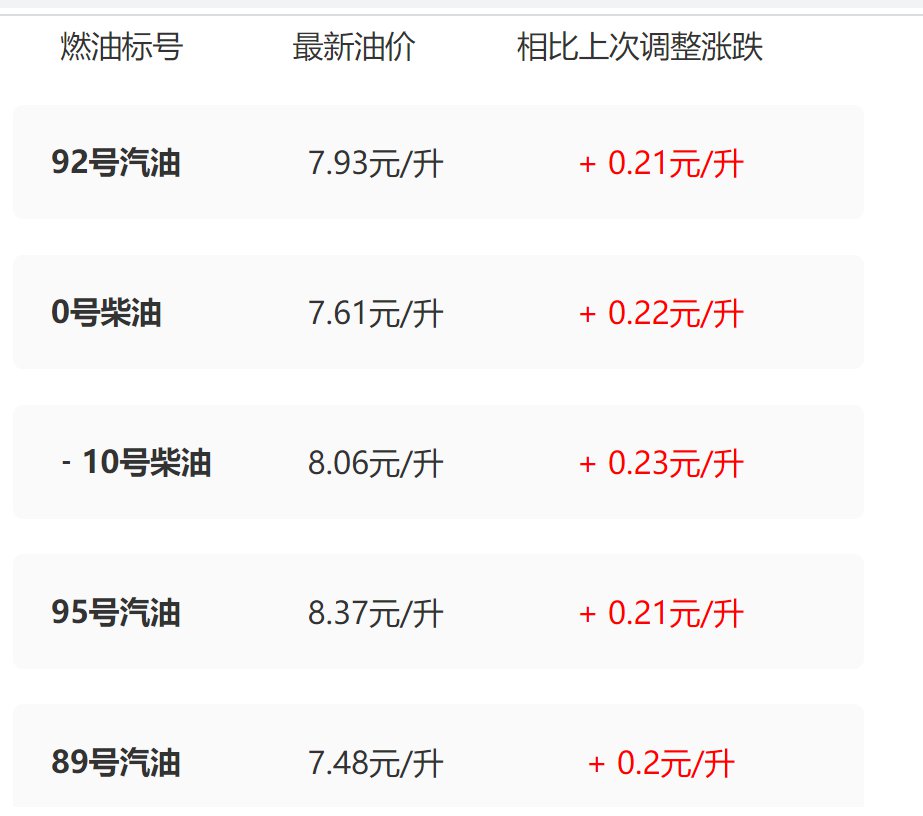 还可查看燃油类型,最新油价,相比上次的涨幅或回落