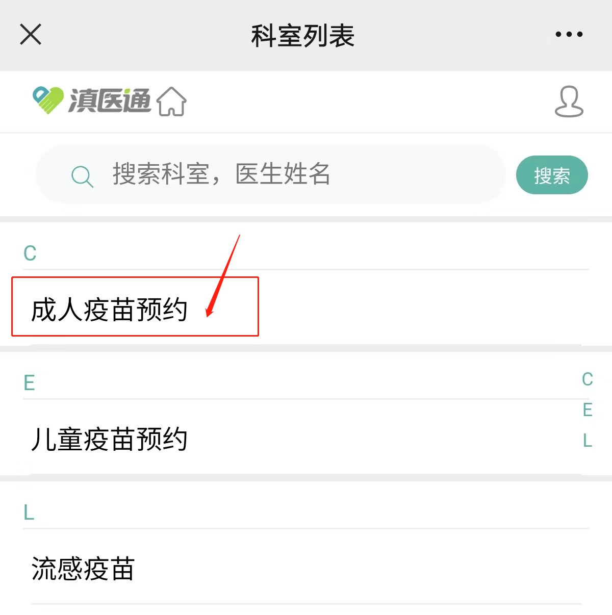第一步:进入公众号预约挂号(获取预约入口直接进入),进入【滇医通】预约入口。