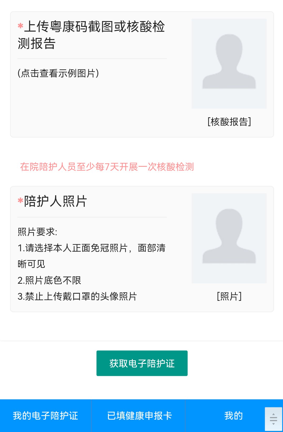 第二步:阅读个人承诺书后请填写并提交7天内核酸检测报告、陪护人员照片等信息。