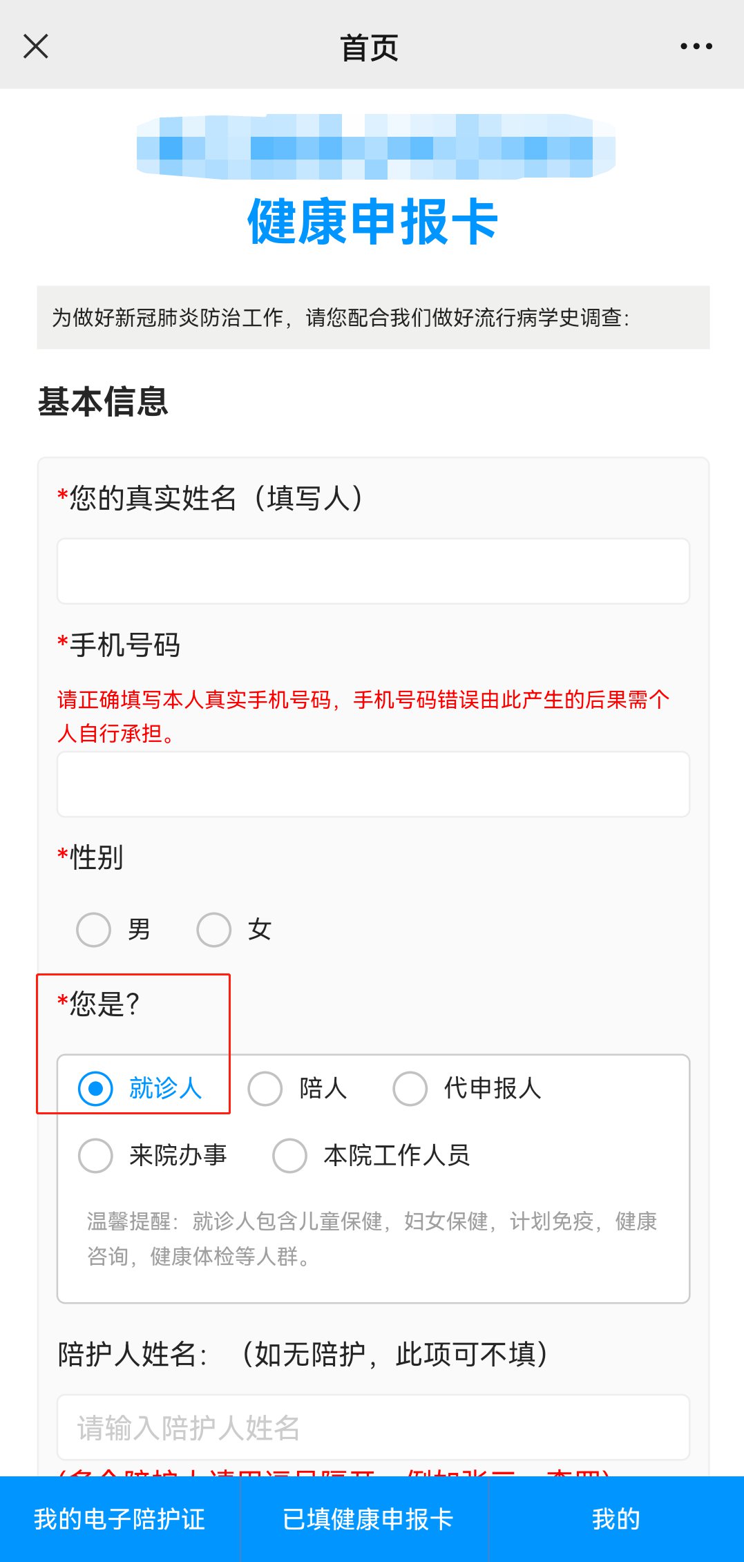 第一步:进入健康申报卡填写页面后,填写本人信息然后选择身份,按照要求填写陪护人或就诊人信息。