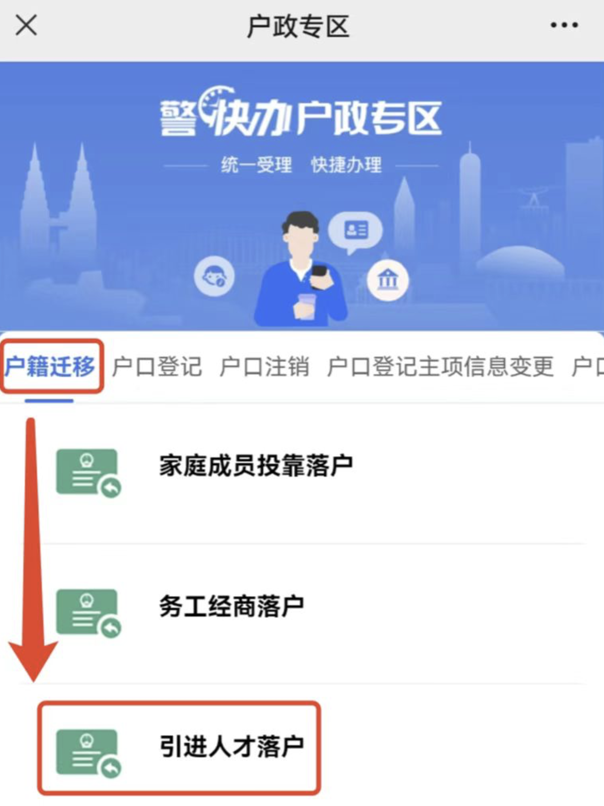 第四步:在“户政专区”列表页的“户籍迁移”分类下,选择“引进人才落户”。