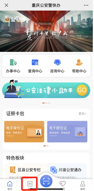 第一步:点击上方办理入口,关注“警快办”微信公众号,关注后点击底部菜单栏“警快办”。