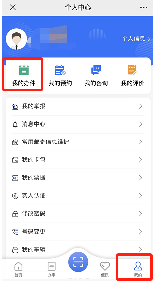 查询进度:可点击平台页面底部“我的”进入个人中心,点击“我的办件”查询办理进度。