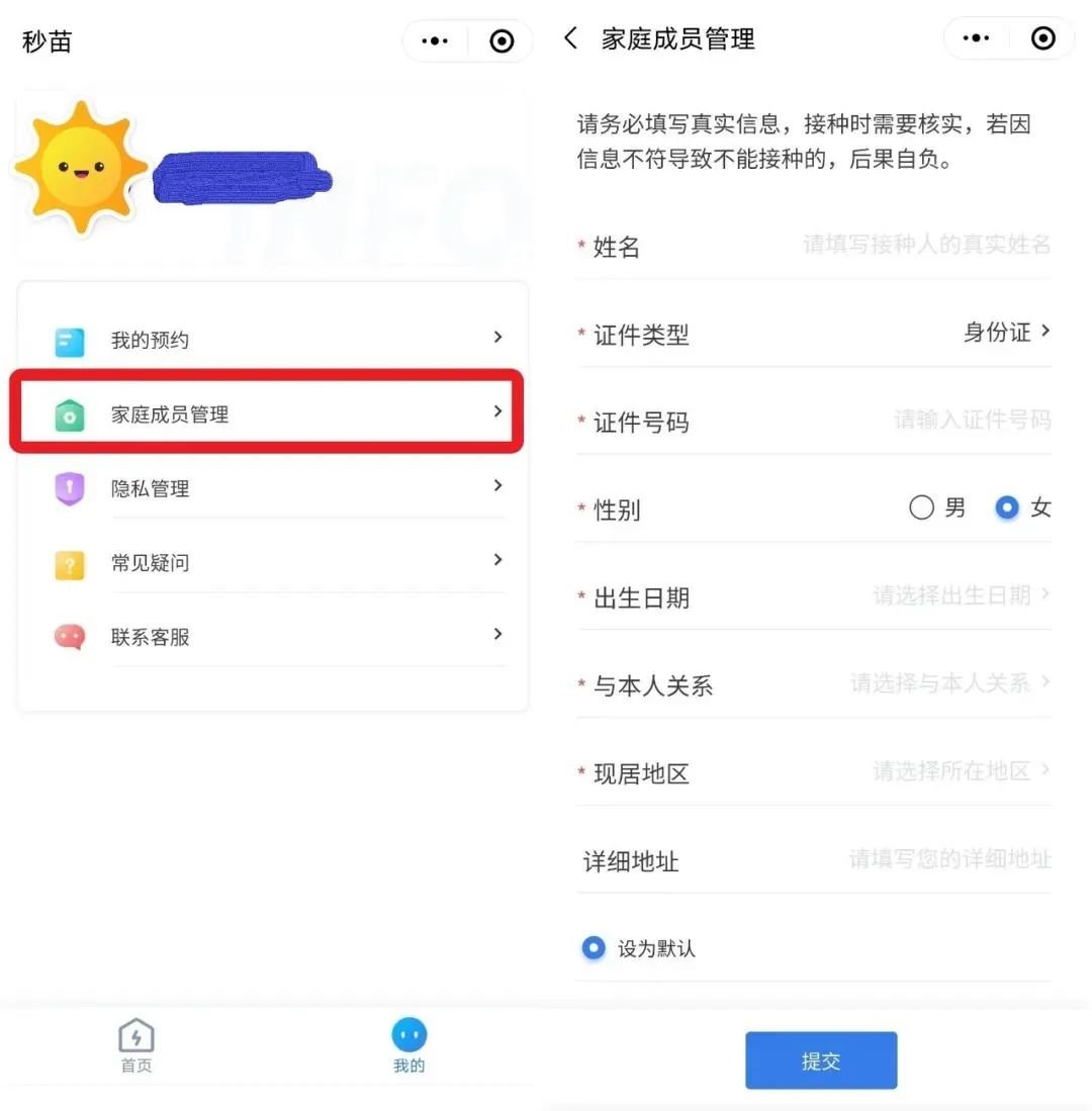 4、提前完善个人信息:点击【我的—家庭成员管理】填写个人信息(已填写过的用户可忽略此步骤);等待抢苗时间;
