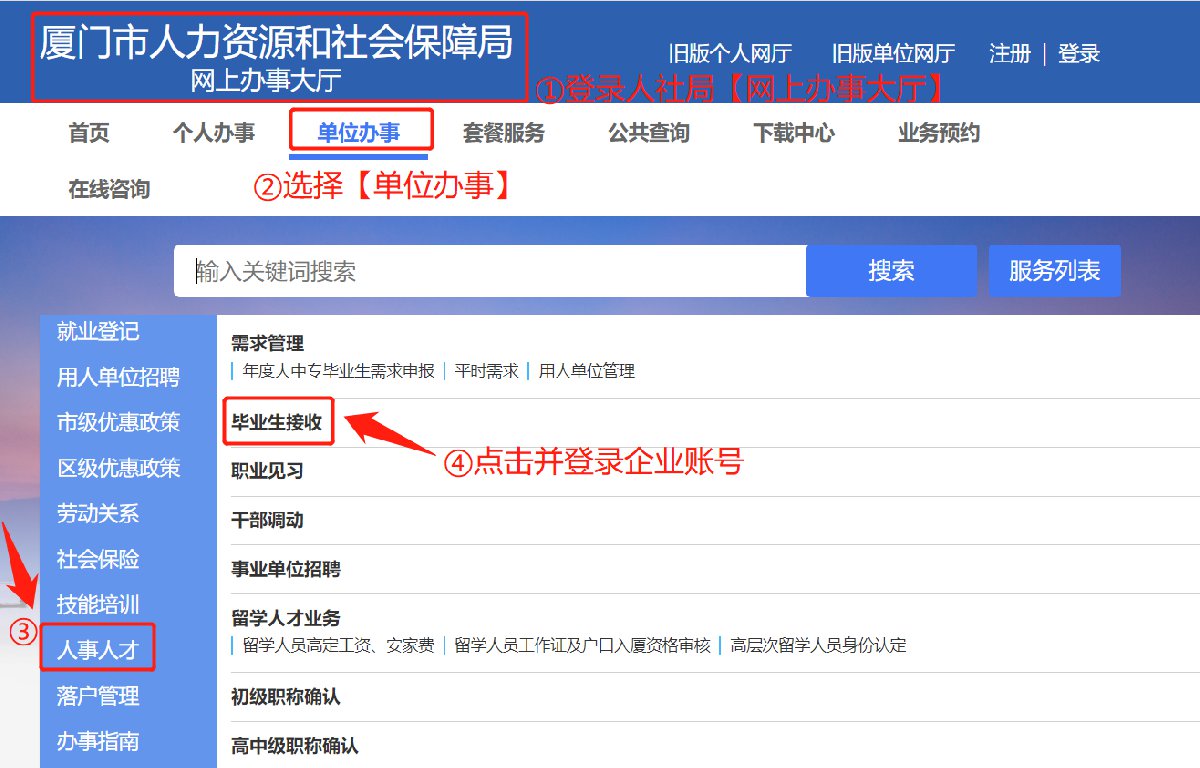 方式二:符合接收条件的毕业生,由用人单位登录厦门人社局官网(http://hrss.xm.gov.cn)“网上办事大厅--单位网厅--人事人才”服务平台,根据提示申报拟接收毕业生个人信息。