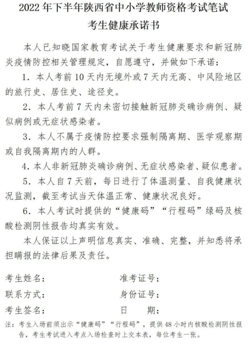 1.考生要按照省教育考试院发布的《2022年下半年陕西省中小学教师资格考试笔试疫情防控公告》要求,提前返回所报考区属地,至考试结束期间务必做好个人防护。