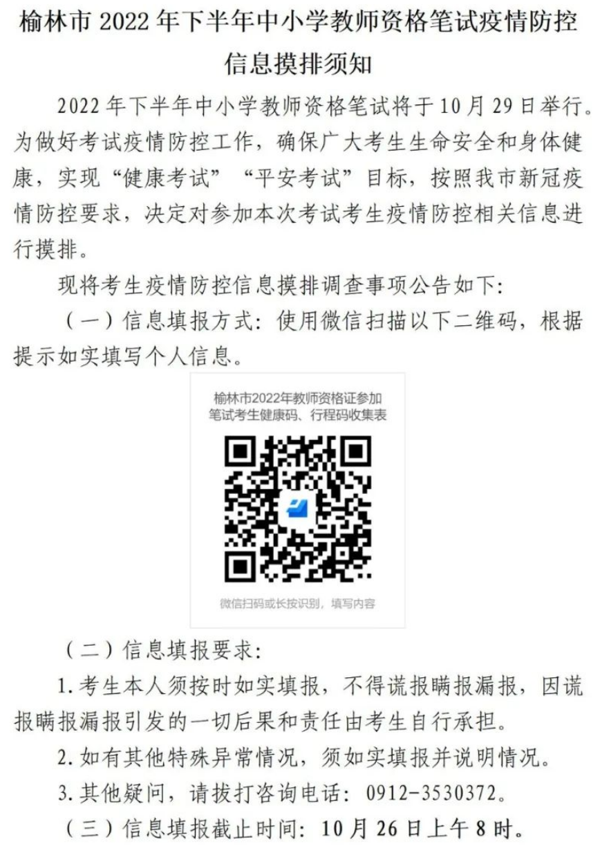 7.根据疫情防控要求,考前对考生防疫相关信息进行摸排,请务必及时关注榆林市教育考试院微信公众号,根据《榆林市2022年下半年中小学教师资格笔试疫情防控信息摸排须知》(附件2)有关提示按时填写上报相关信息。摸排信息仅是为了有助于考试期间的疫情防控,不作为能否考试依据。