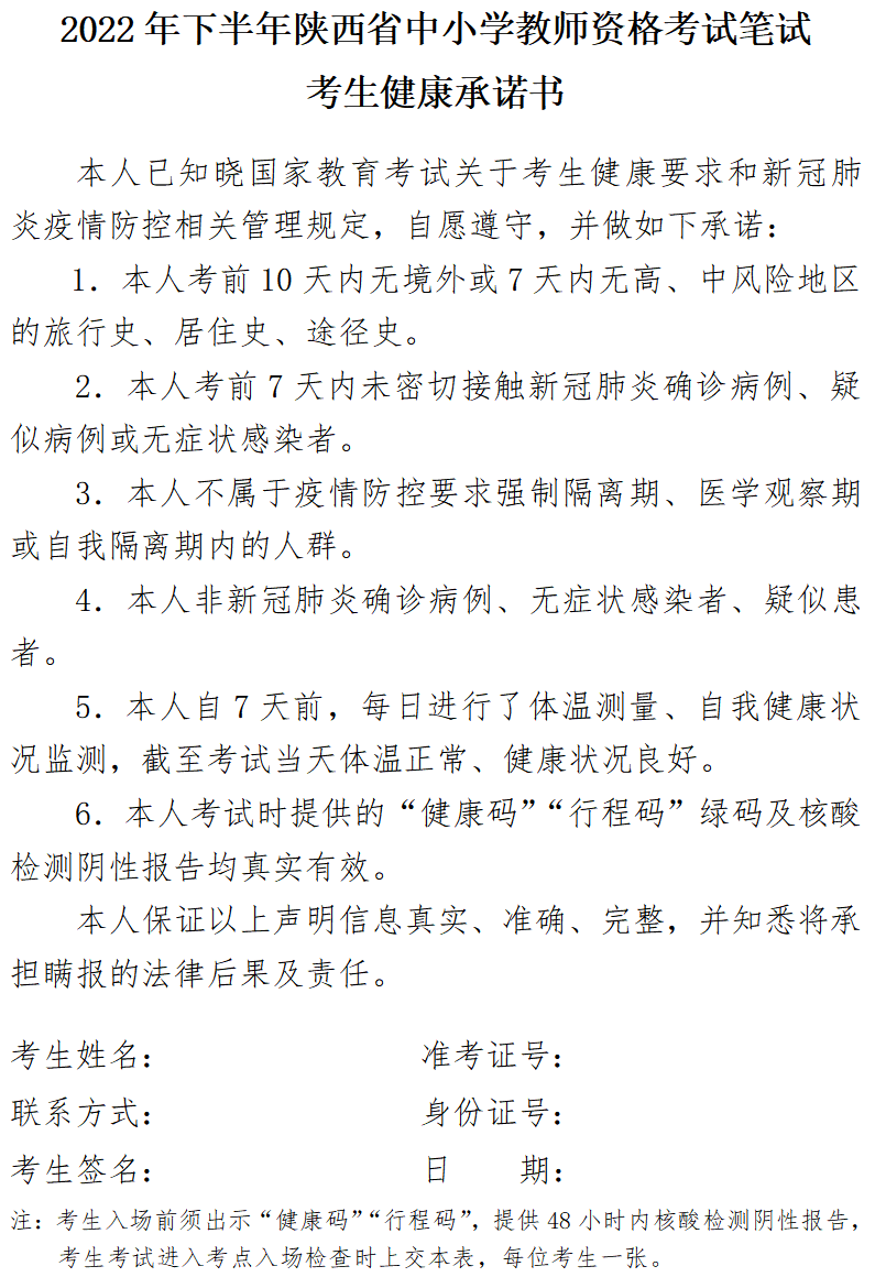 10.考生应提前1小时到达考点,进入考点时要保持安全距离,自觉出示健康码、行程码、48小时核酸检测阴性报告,接受体温检测,进行身份验证,上交健康承诺书。