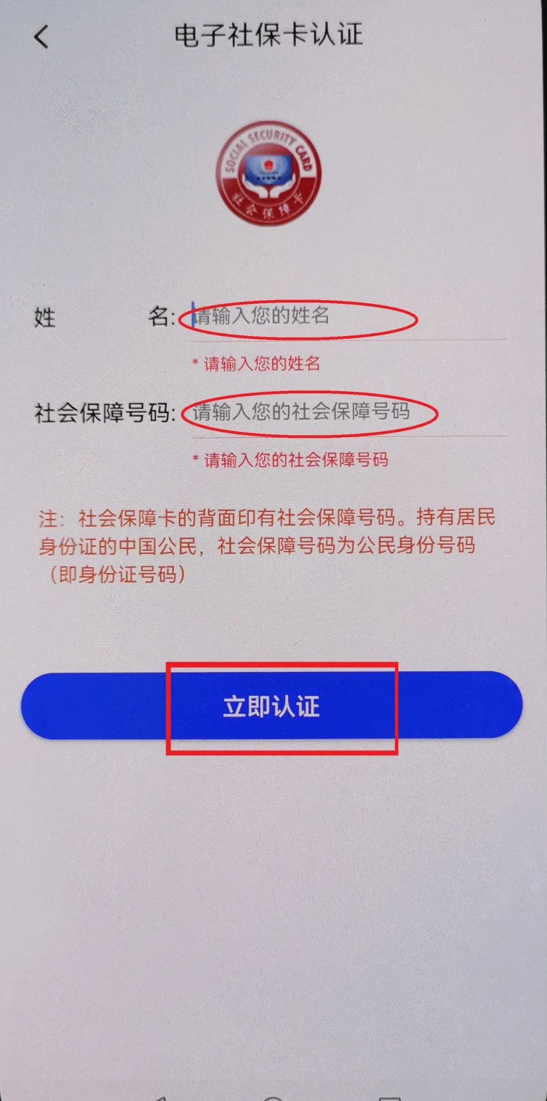 7、填写姓名和社会保障号码(一般为本人身份证号码),点击[立即认证]。