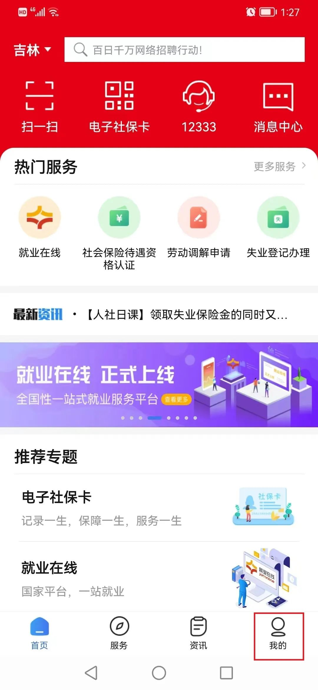 2、下载完成后,进入“掌上12333”首页,点击[我的]。