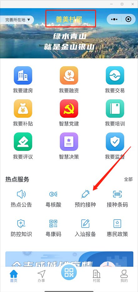 1、搜索并进入“善美村居”小程序—选择预约接种(或在"健康汕尾"公众号点击菜单栏“民生”—进入善美村居)