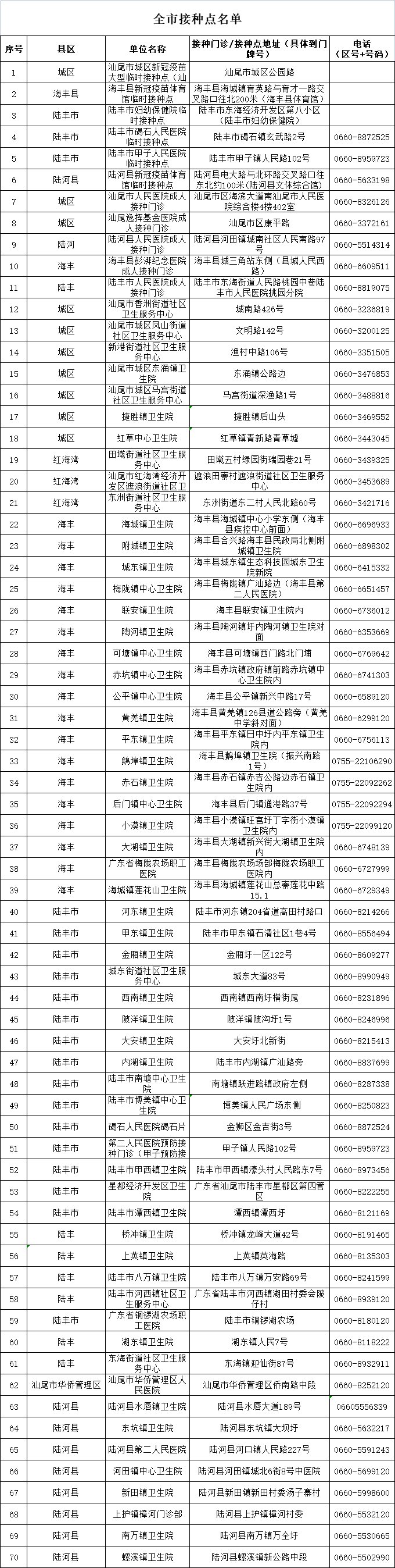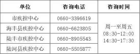 汕尾疾病预防控制中心在5月公布的汕尾市新冠疫苗接种咨询热线,仅供参考:
