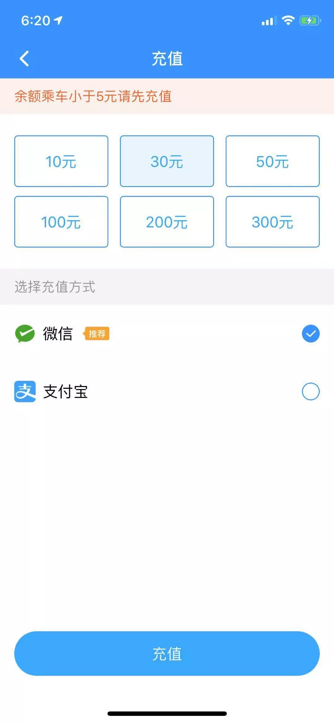选择充值模式的用户可以通过点击刷码乘车页面充值按钮进入充值页面,可自行选择对应所需充值的金额及微信或支付宝充值方式。