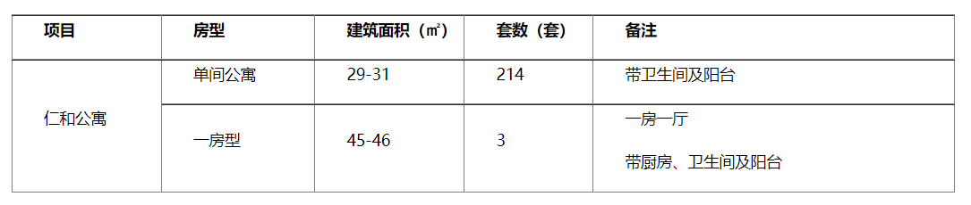 本批次公共租赁住房房源为仁和公寓项目,共计房源217套,租赁期限至2023年8月31日止。