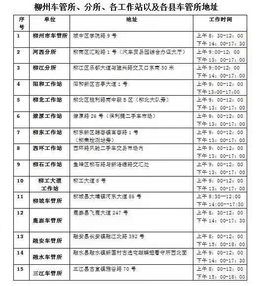 目前,柳州车管所河西分所、柳江分所、阳和工作站、柳北工作站、燎原工作站、柳东工作站、西环工作站、柳石工作站、柳工大道工作站、各县车管所均可办理机动车号牌互换业务(地址附后)。