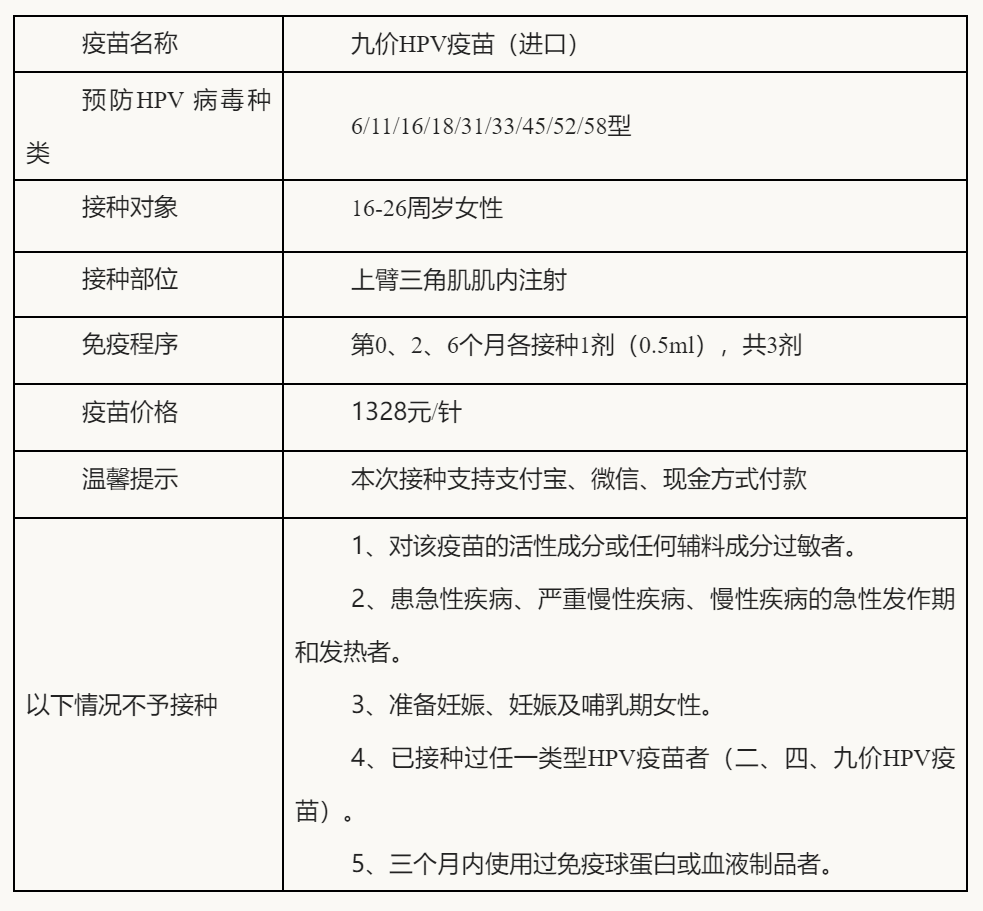 4、HPV 疫苗为非免疫规划类疫苗。九价 HPV 疫苗(进口)每剂1328元,均包含接种服务费。居民可通过微信、支付宝、现金等付款方式进行现场缴费。