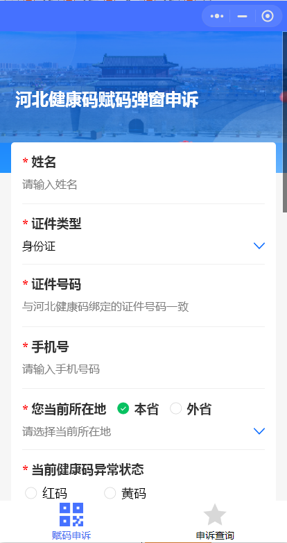 申诉平台:“河北健康码赋码弹窗申诉”小程序